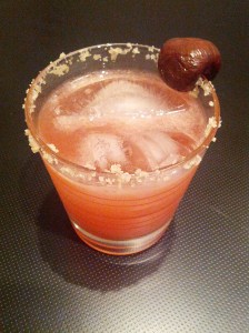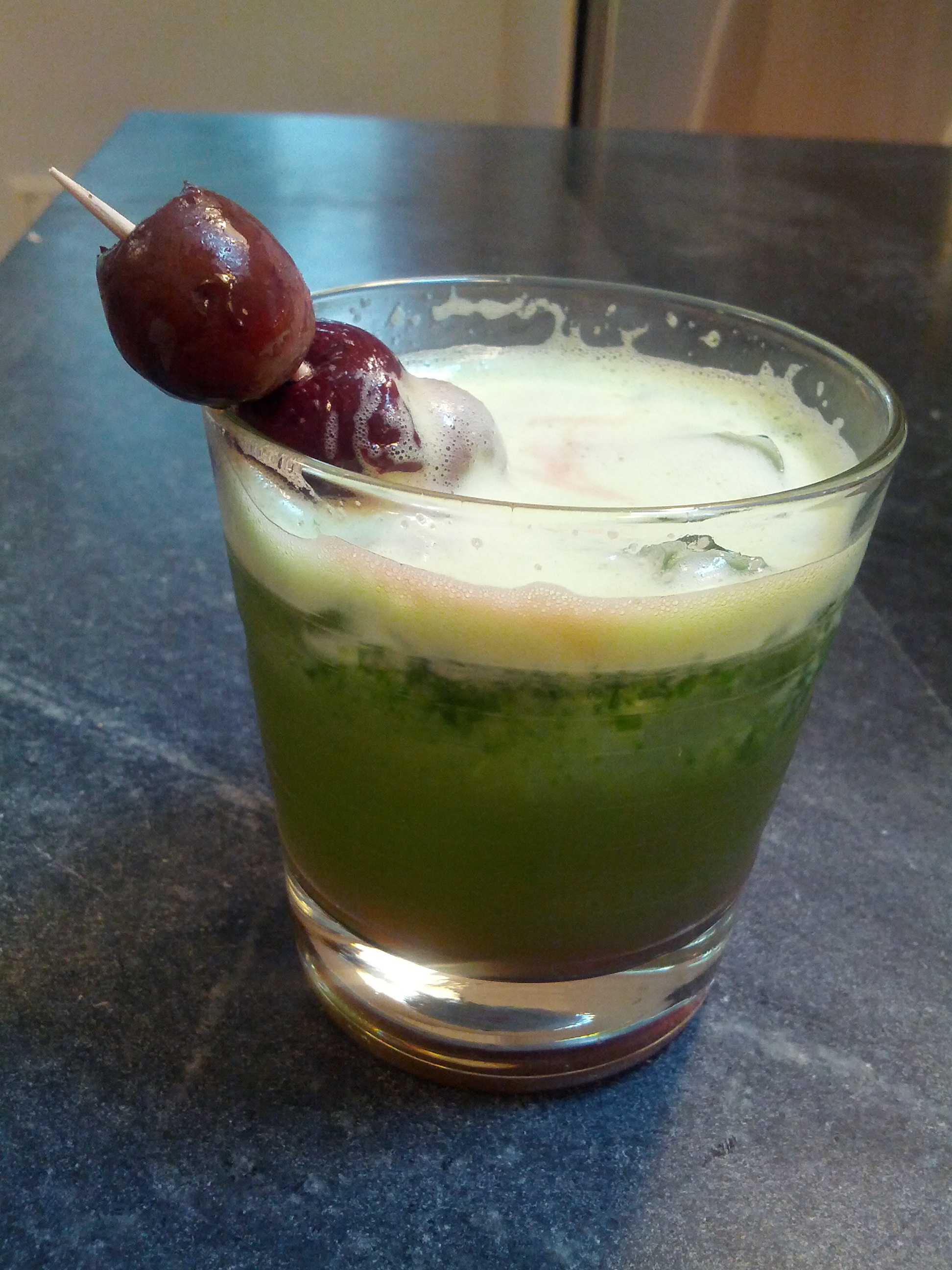 - Combine 2 oz light rum, 2 oz lime juice and 0.75 – 1 oz simple syrup with 6-8 basil leaves in a blender. Blend. (Optional: For extra cherry flavor, add 2-3 smoked cherries.)