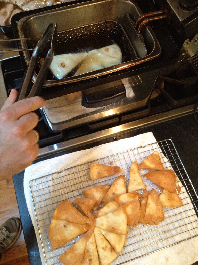 Those of you who know me, know I’m a Cinco de Mayo zealot. In my house, Cinco de Mayo is always celebrated with good homemade Mexican food and, in the past few years, some Mexican food experiments. This year, however, I ended up with an experiment gone wrong. In fact, I had no intention on admitting my food defeat in such a public forum until I saw that Kevin Miklasz over at ScienceFare.org and I were in the same boat. You see, sometime in April my wife and I went to Dos Caminos in Manhattan and enjoyed a Mexican dinner that yielded significant leftovers. The following weekend I was frying up a batch of fish and chips and tossed the leftover restaurant tortillas in the deep fryer. The result, surprisingly, were restaurant-style chips from my own kitchen!