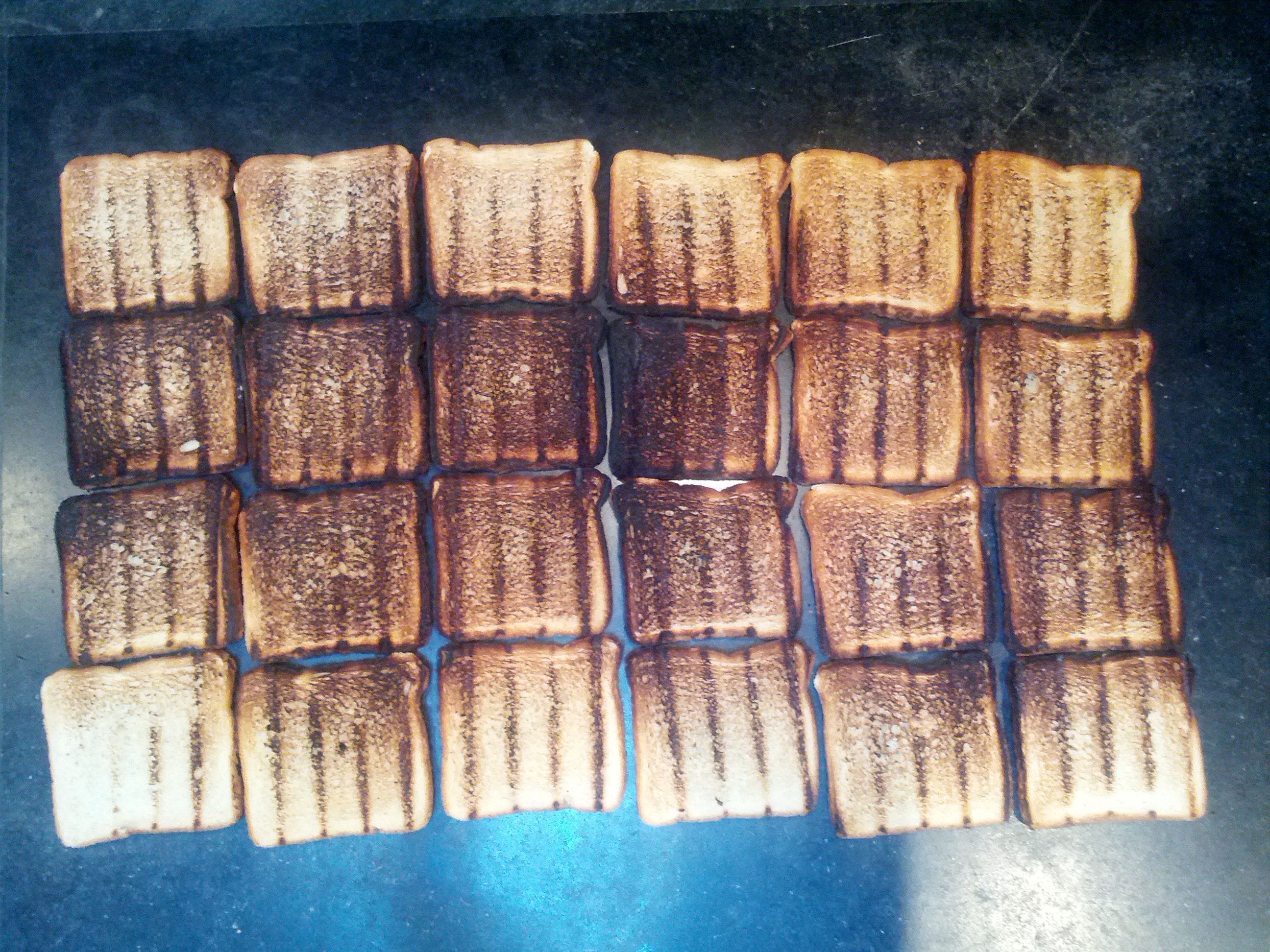 With this in mind, I was able to plop sixteen slices of bread across my hot grill, leave them there, each for equal amounts of time, pull them off and reassemble them on my countertop into a mosaic-like heat map of the cooking surface.